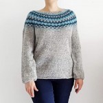 Le corps et les manches se tricotent en rond depuis le bas jusqu’à l’emmanchure et sont assemblés pour tricoter l’empiècement en rond. Les manches sont larges et l’encolure plus dégagée que les modèles traditionnels.