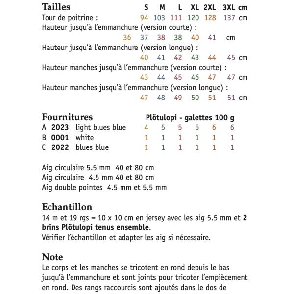 Le corps et les manches se tricotent en rond depuis le bas jusqu’à l’emmanchure et sont joints pour tricoter l’empiècement en rond. Les tours commencent et se terminent sur le côté gauche du corps. Au niveau de l’empiècement les tours commencent et se terminent à la jonction du corps et de la manche sur le côté gauche du dos. Des rangs raccourcis sont ajoutés dans le dos de l'encolure.
